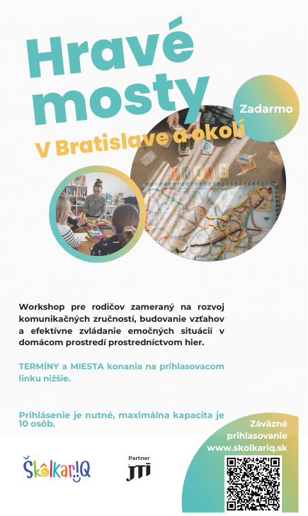 Workshop pre školy a predškolské zariadenia za prítomnosti detí aj pedagógov zameraný na spoznávanie dôležitosti hier pri rozvoji kognitívnych schopností, sociálnych zručností a emocionálneho uvedomovania. Prihlášky a podmienky TU